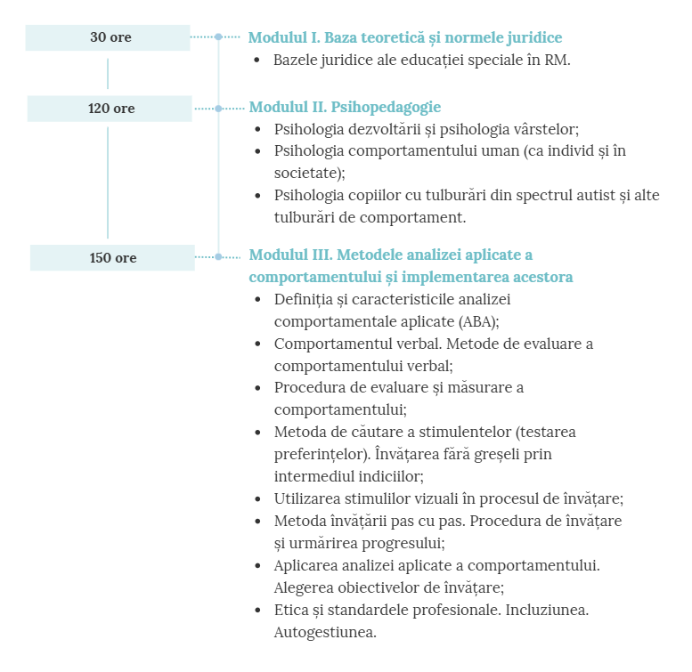 Programul cursului va contribui la aprofundarea cunoștințelor despre comportament și tulburări comportamentale, vă va învăța să selectați formele potrivite de intervenție și să corectați comportamentul nedorit, să stabiliți obiective actuale de lucru și să elaborați programe individuale eficiente pentru formarea de noi abilități, să susțineți procesul educațional și să lucrați în echipă.